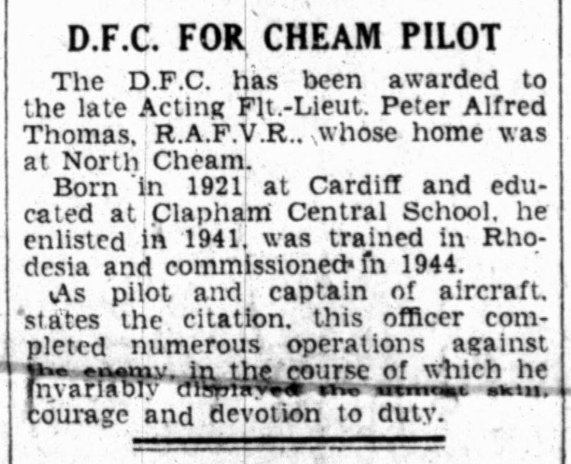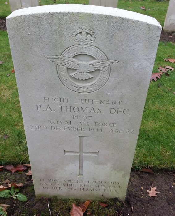 Peter Alfred Sydney Thomas was born on 22 July 1922 in Cardiff, Glamorgan, Wales, the son of Alfred Nicholas Thomas (1900–1994) and Dorothea May Davis (nee Shurmer) (1902–1979). He was baptised on 2 September 1924 at St John the Evangelist Church in Canton, Glamorgan. Peter grew up with four siblings: Cameron Victor (1924–2004), Jean Kathleen May (1925–1999), Alfreda Mary Cecily (1930–1994), and Rose Marie (1933–1977). The family later moved to London, where Peter attended Clapham Central School. By 1939, at the outset of the Second World War, he was living with his mother at 37 Hazelbourne Road, Balham, London, and working as a laboratory assistant. His father may have been away from home at the time, likely due to his work with the BBC where he was a wireless engineer. Peter served in the Royal Air Force during the war. He tragically lost his life during air operations over enemy territory on 23 December 1944, at the age of 22. He was awarded the Distinguished Flying Cross posthumously. |
