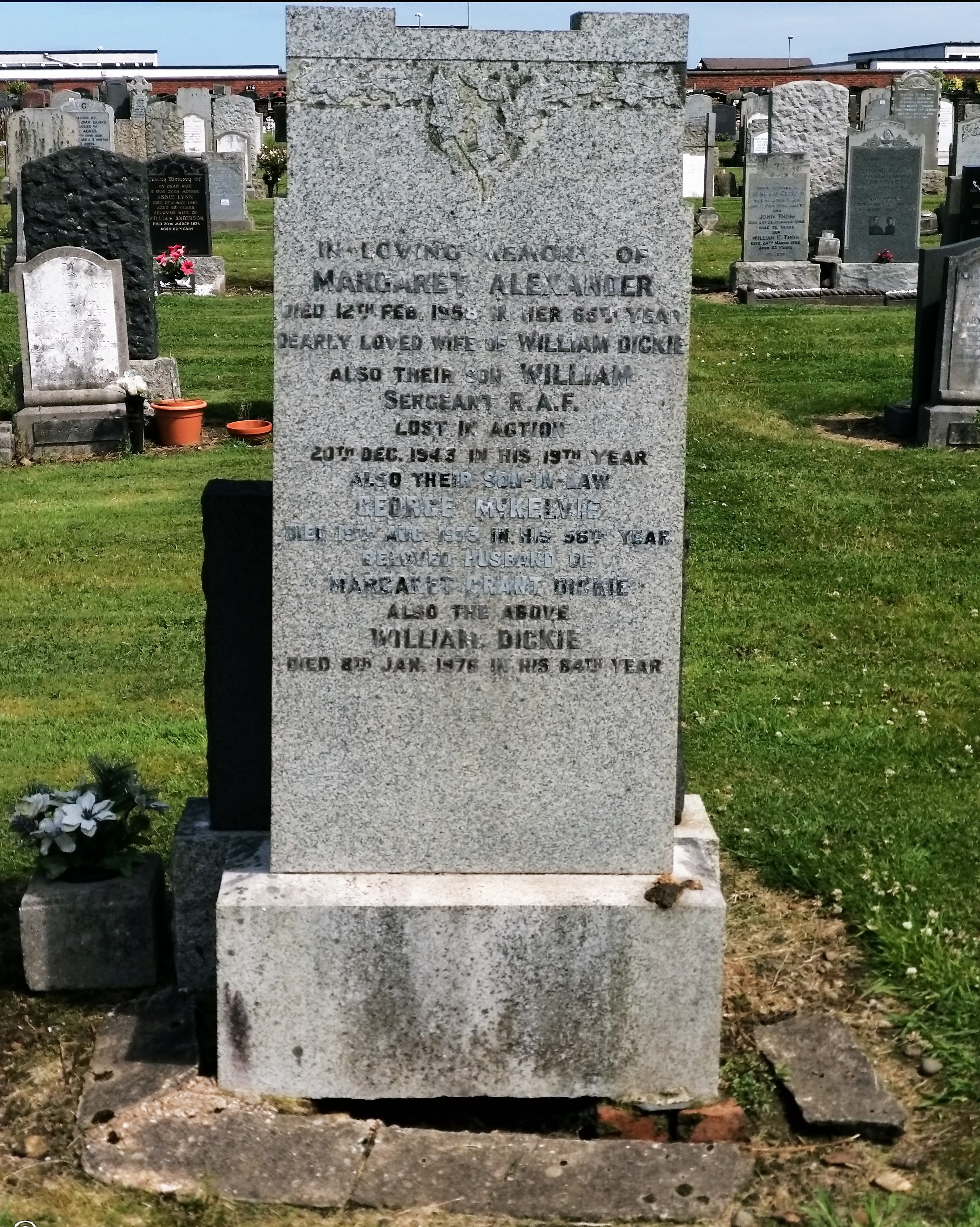 William Dickie was born 8 February 1924 in Saltcoats, Stevenston, Ayrshire, SCotland, son of William Dickie (? - 1978) and Margaret Alexander (? - 1958). He had a sister Margaret Grant (1921 - ?) - later Margaret McKelvie. Margaret was lining in Saltcoats in 2002. William attended Androssan Academy, Ayrshire. There is a memorial to him at the college. 576 Squadron Memorial Project |